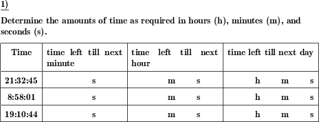 A table is shown. In the first column, a time is given as a point in time in the form of HH:MM:SS. In the following columns, it is required to insert the amounts of time it takes to reach different points in time: