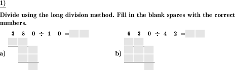The long division is shown in full with some number places in the intermediate subtrahends and minuends replaced by blanks. These blank spaces have to be filled in correctly.