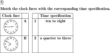 Two columns are shown. The first column shows a series of clock faces of analog or digital clocks. The second column shows textual time specifications like "quarter to five". In every column, all clock faces and time specifications are different from each other so there is only one clock face in the first column that matches exactly one of the time specifications in the second column.